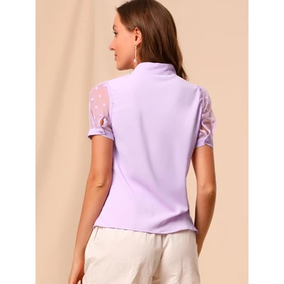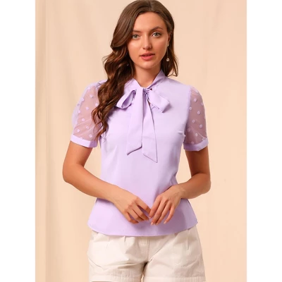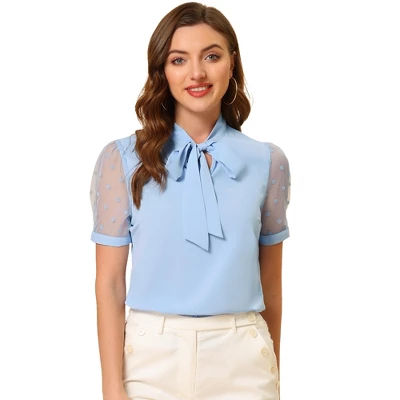 Simple and delicate, this blouse features a bow-tie neck, a V-neck, a tie collar, and short mesh sleeves. Mesh sleeves sweeten this bow-tie-neck blouse. Add a completely cute and unique vibe to your look with this bow tie blouse. Perfect to pair it with skinny jeans for a smart and casual look. Machine Wash Cold with Like Color. Iron at Low Heat. Do Not Bleach.