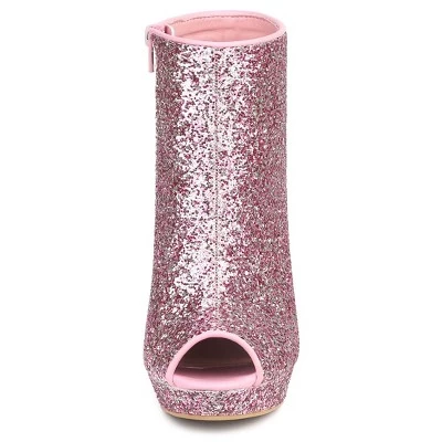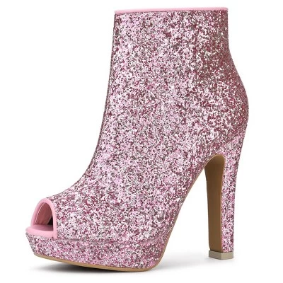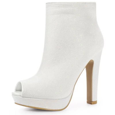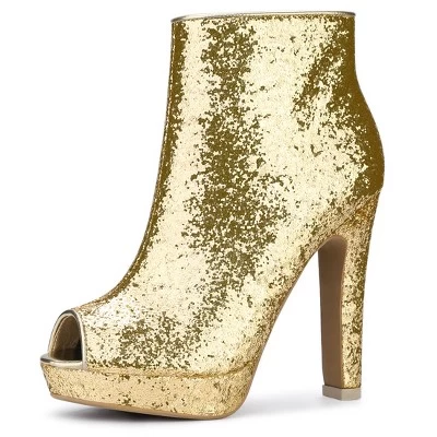- Open Toe Glitter Boots, Platform Chunky Heel Ankle Boots, Zip Closure, Gold, Pink, Silver, White Color