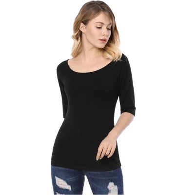 This half-sleeve top features a Scoop neck and a slim fit. This absolutely essential top is perfect for dressing up or down. Style it with jeans or denim shorts. A stretchy pure-color design perfects the figure-flaunting fit of this lithe comfortable tee. The ultra-comfortable composition moves with you throughout the day. The model is wearing a Small size.