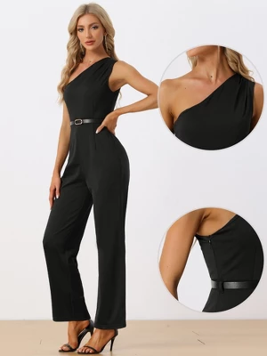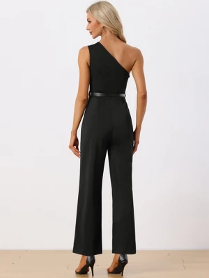 - This jumpsuit is made up of several design points: One-Shoulder, Sleeveless, Belted, Wide Leg