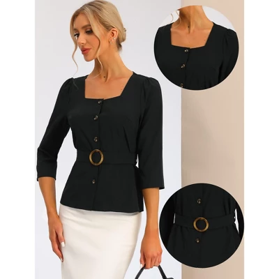 - This blouse is made up of several design points: square neck, button up, solid color, 3/4 sleeve, with belt