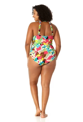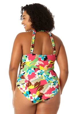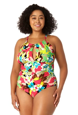 Make a splash at the beach with this eye-catching plus size High Neck Swimsuit with Ruffle Straps. This plus size one piece swimsuit features a beautiful high neck design and a bright floral print that will turn heads in any setting. Elegant ruffle straps and shirred sides ensure a figure-flattering fit for your silhouette. You’ll be lounging in all day comfort and style under the sun. Grab our Flounce V Neck Tunic Cover Up and your favorite beach sandals for a complete beach day look.