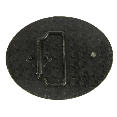 A scenic carved picture on a belt buckle measuring 3.5 by 2.75 inches. The metal loop on the back fits belts up to 1.5 inches in width. Two elks are in grass in front of a river and mountains, with eagles in the distance.