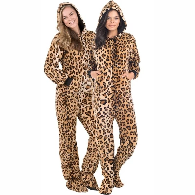 Prowl into the night wearing these jungle kitty inspired leopard print footie pajamas with hoods! Gorgeous, plush chenille pairs purrfectly with this exotic spotted pattern! Ultra-cozy, high-quality and beautifully designed: beige, brown and yellow undertones lay beneath dark brown and black spots of varying sizes. Channel your inner feline! Sleep, lounge, or play in these warm, wonderful and wild onesies!