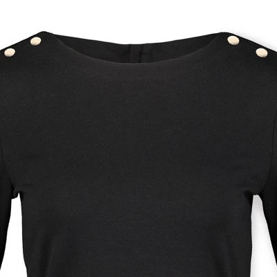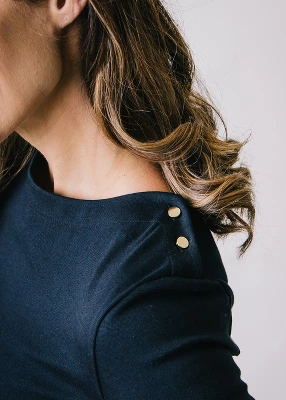 - Gold buttons at the shoulders and hidden zipper down the center back. Machine washable.