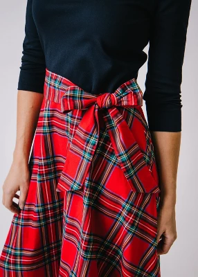 - Bodice is a forgiving and flattering knit ponte, paired with a woven twill skirt and waist sash that drapes beautifully on the body.