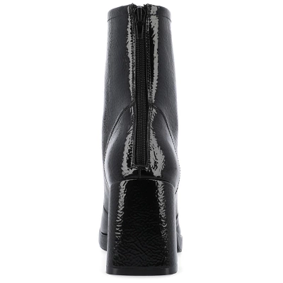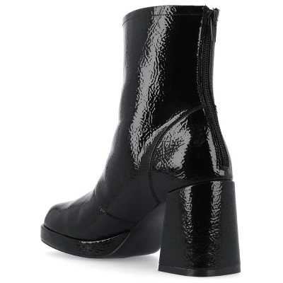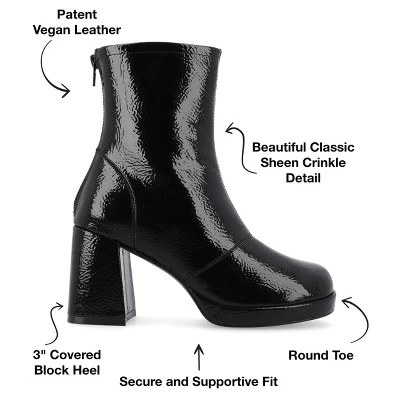 Introducing Aylani, the modern and sleek bootie from Journee Collection. With a 3 in block heel featuring a platform at the toe, zipper at the heel, and round-toe, Aylani is the perfect combination of bold and minimalistic style. Made from a 4 mm Tru Comfort Foam™ insole and crinkled patent vegan leather with a center seam, Aylani is the must-have addition to any wardrobe that wants to make a statement.