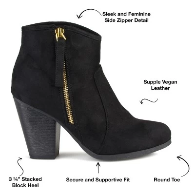 Show off chic style in heeled booties by Journee Collection. These booties feature premium faux suede uppers that rise to the ankles. Chunky Cuban heels and outside gold-tone zippers complete the look. At Journee Collection, our booties will give you that comfortable yet stylish look, perfect for when you’re in the office all the way to a fun night out with the girls.