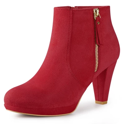 - Platform, Round Toe, Side Zip Closure; Chunky Heels Boots