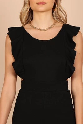 Looking for a jumpsuit that will make you feel like the life of the party? Look no further than this round neckline beauty! Featuring non adjustable straps with ruffle detail and a back opening with tie close, it’s sure to turn heads.