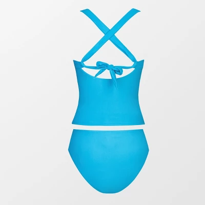 Get active seaside in this shapely tankini set. Featuring a tankini top with a v-neck, ruched detail, crisscross back, back self-tie, and adjustable wide straps with an o-ring design. Matching a pair of mid-rise bottoms with standard coverage offers comfortable wear.Product Code: DAA12D3A001TT